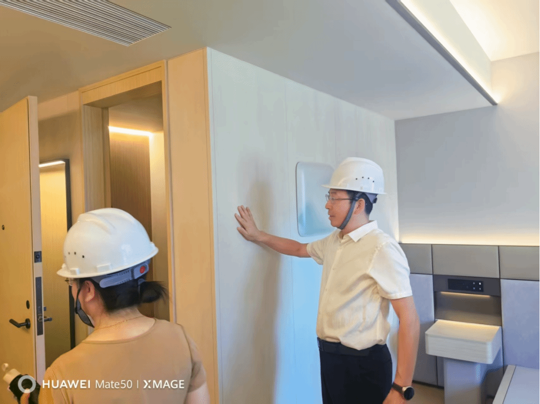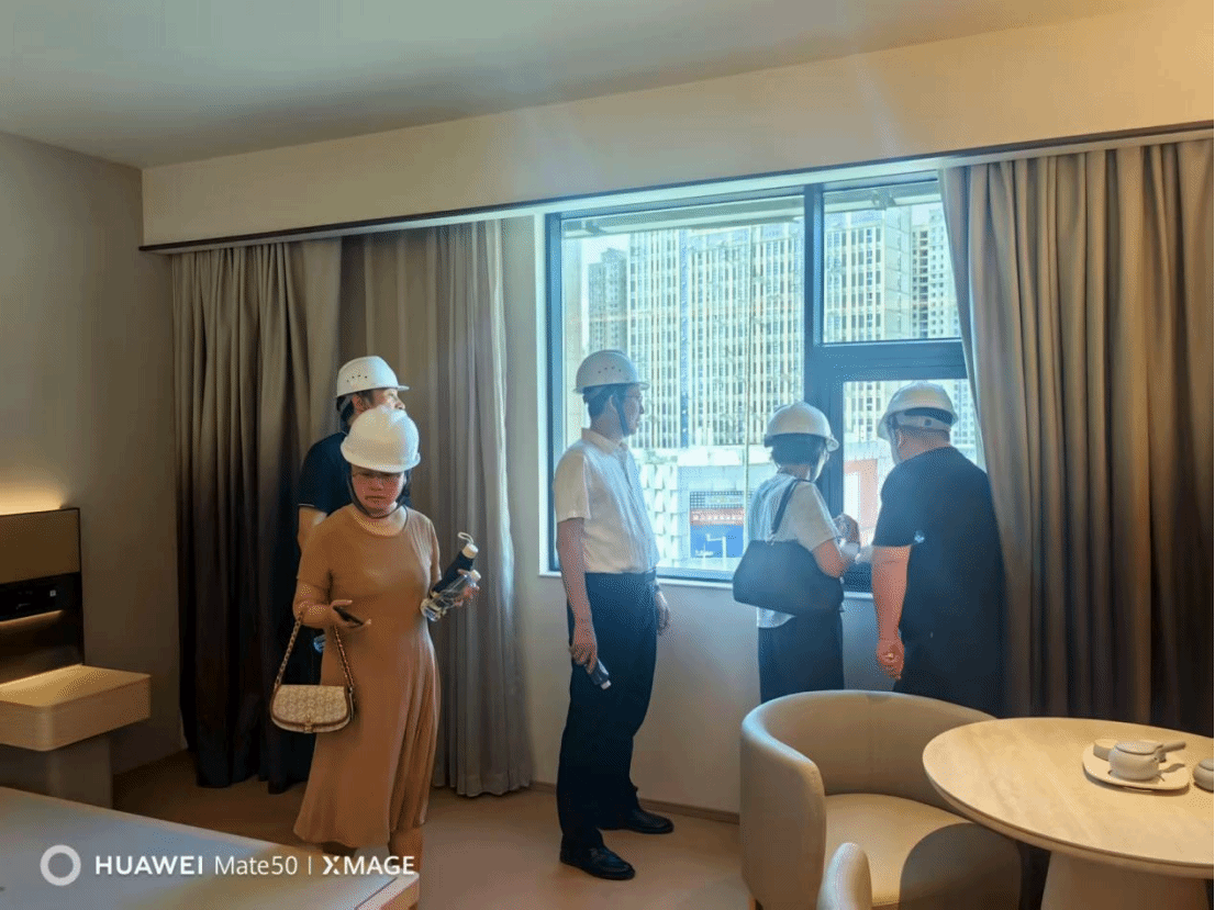 检查组一行依次踏勘酒店样板间、前厅、后勤通道等关键区域,围绕消防、施工质量、用电安全、功能布局与细节品质逐项对标核查。